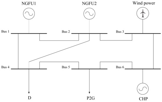 The six-bus power system [28,30], as shown in Figure 3, consists of a CHP unit, two NGFUs, a P2G plant, and a wind farm. All of the three generation units are gas-fired units. The natural gas price is 30 $/MWh [23].
