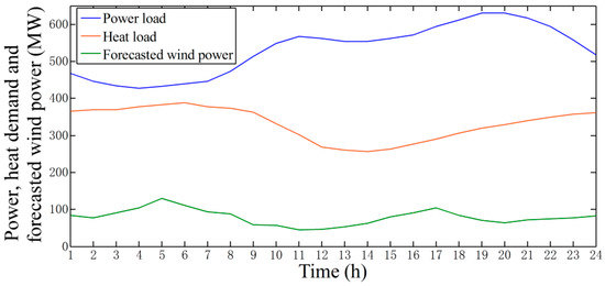 The profiles of power, heat demand, and forecasted wind power are shown in Figure 6. The heat demand can be increased or decreased by 10% of the original heat load. The district heating control of individual heat consumption is not considered in this paper. The simulations are considered for the hourly generation dispatch over 24 h. All of the simulations were implemented in MATLAB R2013a and solved by Gurobi 6.5 on a computer with two Inter Core i5 CPU (2.5 GHz) and 4.0 GB RAM.