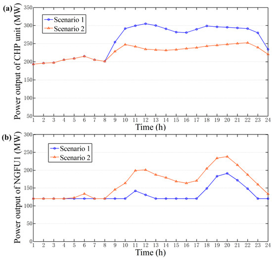 The hourly power dispatch results of the CHP unit and NGFU1 in Scenario 1 and Scenario 2 are shown in Figure 7. It can be observed that the power outputs of the CHP unit in the first eight hours are the same in the two scenarios, but at other times, the power outputs in Scenario 2 are less than those in Scenario 1. However, for NGFU1, the results are the opposite and the outputs increase, even in the off-peak hour (at 6:00). The power outputs of NGFU2 have not changed, but the wind power curtailment rate increases from 23.1% to 24.0%. The reason for this lies in the power outputs of the CHP unit between 9:00 and 24:00 in Scenario 2, which are restricted by natural gas transmission and supply constraints. This part of the power is substituted by NGFU1, which has a wider natural gas transmission and supply margin. Additionally, the increased power outputs of NGFU1 hinder part of the wind power integration.