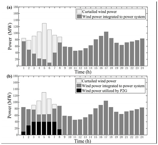 The power dispatch results of the wind power and P2G in Scenario 2 and 3 are depicted in Figure 8. It can be seen that in Scenario 2, the wind power is largely curtailed during the periods when the power demand is low and the heat demand is high. In Scenario 3, the integration of P2G largely promotes the wind power accommodation, decreasing the curtailment rate of the wind power from 24.0% to 9.7%. The reason for this is that the P2G utilizes the surplus wind power to produce natural gas, creating an extra margin for wind accommodation in the off-peak hours.