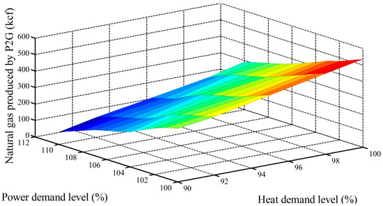 The power-to-gas technology utilizes surplus power energy from renewable energy to produce hydrogen by the process of electrolysis. The produced hydrogen can be injected into the natural gas network or further converted to synthetic natural gas by additional methanation combined with carbon dioxide. However, the amount of hydrogen injected into the natural gas system should be limited, since blending hydrogen into the natural gas network will reduce the energy density of the gas and have a bad effect on the pipeline material. In the UK, the maximal level of hydrogen in the natural gas network is currently limited to 0.1% (by volume) [25]. Therefore, in this paper, we assume that all of the produced hydrogen is converted to natural gas. The conversion from power to natural gas production has a 60–65% efficiency [35].