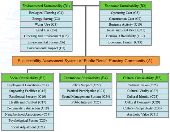 We have established the integrated sustainability assessment index system of public rental housing community according to literature and policy analysis and evaluator scoring including five first-level evaluation indices (i.e., environmental sustainability, economic sustainability, social sustainability, institutional sustainability and cultural sustainability) and 31 second-level evaluation indices (see Figure 2).