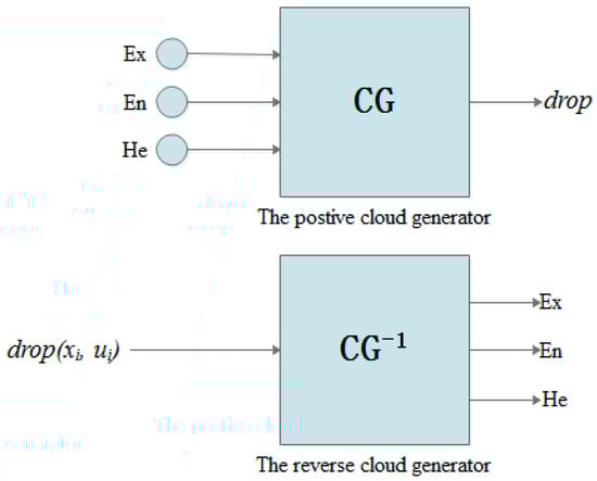 The cloud generator is used to realize the reciprocal conversion between quantification and qualification in the cloud model theory [98]. The cloud generator can be classified into two types: positive cloud generator; and reverse cloud generator. The positive cloud generator can realize the transformation from a qualitative concept to a quantitative representation, which is a qualitative to quantitative mapping; it can output a series of droplets according to the digital eigenvalues of the cloud (Ex, En, He) and quantitatively express the qualitative concept through the uncertainty transformation of the cloud model. The reverse cloud generator can realize the transformation from a quantitative representation to a qualitative concept. It can transform a certain number of cloud drops to the three digital eigenvalues of the cloud (Ex, En, He). The processes of the positive cloud generator and the reverse cloud generator are shown in Figure 3.