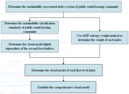 By using the digital eigenvalues of the comprehensive cloud model to draw the cloud chart of the comprehensive sustainability assessment of public rental housing community, we can get the specific information of the overall sustainability of public rental housing community. In this way, we use the AHP-entropy weight method to determine the weight of each indicator, and then use the cloud model theory to finish the comprehensive sustainability evaluation of public rental housing community. The specific process is shown in Figure 4.