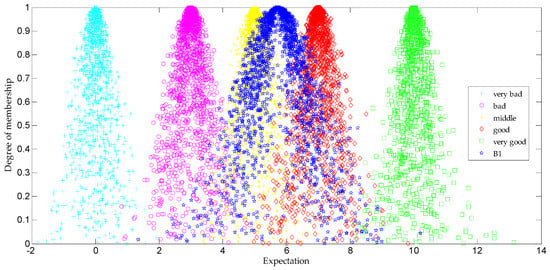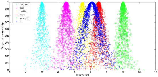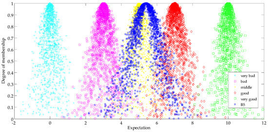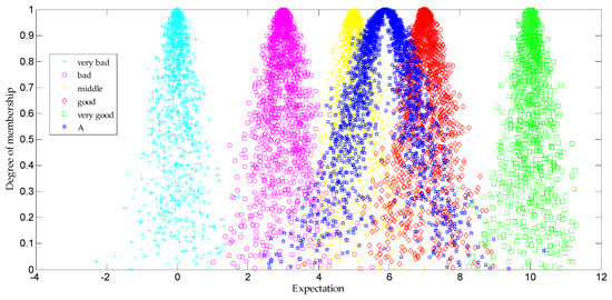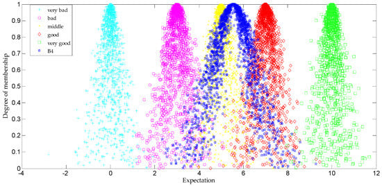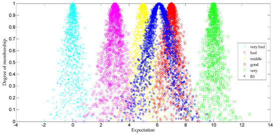 In the cloud theory, three digital eigenvalues [93] of the cloud are used to reflect the overall characteristics of the conception, i.e., Expectation (Ex), Entropy (En) and Hyper Entropy (He). Expectation (Ex) is the most representative point of the qualitative conception C. Entropy (En) reflects the measurable granularity of C. It is determined by the randomness and fuzziness of the qualitative conception. The greater En, the greater fuzziness and randomness of the object. Hyper Entropy (He) measures the uncertainty of En, i.e., entropy’s entropy. It reflects the condensation degree of the cloud droplets and is determined by the randomness and fuzziness of En.