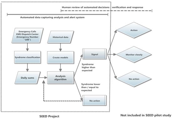 The pilot project SEED, co-funded by the Indian Council for Medical Research and the German Ministry of Research and Education, was conceptualized and based on earlier experiences from the EMS syndromic surveillance project SIDARTHa [,,,]. The original project structure is shown in Figure 1. The starting point for the project was the assumption that calls from emergency medical services are routinely collected in electronic formats and can thus be analyzed and used for symptom/syndromic surveillance.
