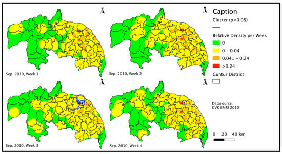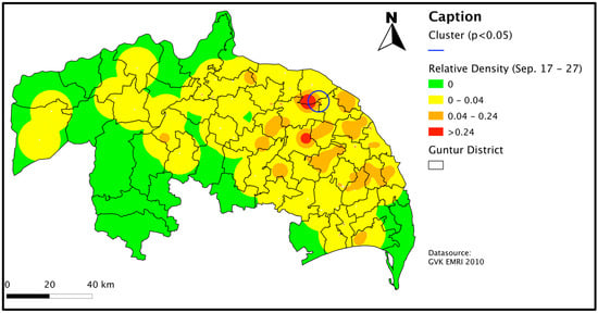 (III) The case study was performed for one selected district of undivided Andhra Pradesh in collaboration with GVK Emergency Management and Research Institute (GVK EMRI). GVK EMRI is the sole provider for emergency medical services in Andhra Pradesh under an exclusive state contract (PPP). The analysis was both retrospectively and prospectively undertaken using the symptom of Acute Undifferentiated Fever (AUF) to test the potential of early space–time identification of dengue outbreaks within the district. For the cluster detection of AUF, a space–time permutation model within the SaTScan software [,] was used. For the interpolation of the cases per km2, a kernel density estimation using the CrimeStat IV software was used. The results were then imported for visualization in Quantum Geographic Information System (QGIS) []. For the verification of the detected outbreaks, local newspapers and additional medical records (where available) were consulted.