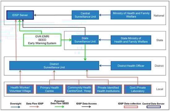 For rapid responses, containment and warning in case of an infectious disease outbreak, the responsible health authorities need the ability to quickly assess the actual impact and the potential risks. The effectiveness of this ability is determined by the availability of sound and up-to-date health information on infectious diseases. In response to these challenges the Government of India has initiated and partially implemented the Integrated Disease Surveillance Programme (IDSP). Its intention is to detect early warning signals of disease outbreaks and coordinate responses accordingly [,]. The IDSP is a decentralized, state-based surveillance system for a range of diseases that are of public health importance. The health data are collected at various entry points and are submitted to the district level. Reporting from the District Surveillance Unit (DSU) to the State Surveillance Unit (SSU) and the Central Surveillance Units (CSU) is done weekly via the Internet using the central IDSP portal. The IDSP weekly report includes three different standard reporting forms reflecting the range of specificity of the data. Interviewed experts agree that, so far, IDSP has not been able to achieve effective integration of interventions and strategies for public health. Involvement of the private sector (general practitioners, clinics, private labs, etc.) has been attempted in only a few regions and with limited success. The coverage of districts remains patchy, leading to wide gaps in ownership, resources, and reporting quality. According to the experts interviewed, one positive way to further strengthen the IDSP, in particular the early warning component, is the use of additional data sources for outbreak detection, including, for instance, EMS data.