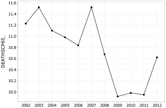 Average cardiovascular and respiratory fatalities of people over 65 years of age (DEATHSCP65_) per year.
