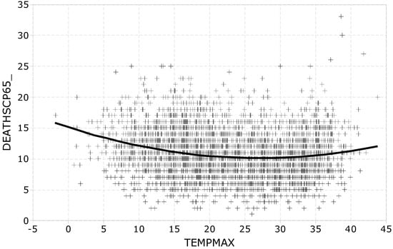 The maximum temperature is regarded as the most representative [30]. As an illustration of the functional form of the above equations, Figure 3 depicts a scatter plot of the mortality count per month as a function of the average maximum temperature values for the years 2002–2012.