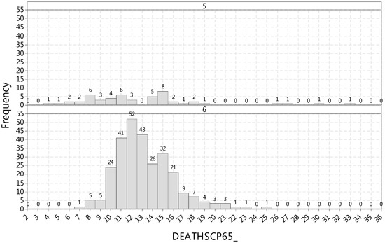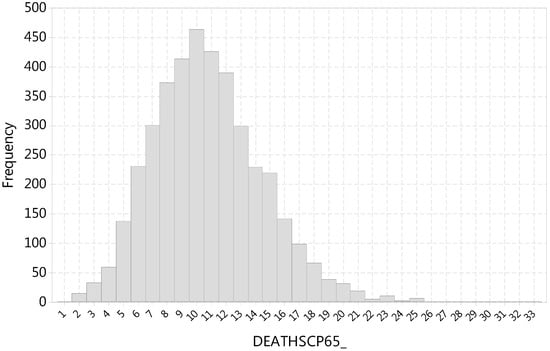 Considering the entire population of people over 65 years of age in Athens, DEATHSCP65_ is a rare event that takes positive integer values ranging from one to 33. As shown by the histogram of discrete values in Figure 4, the distribution of DEATHSCP65_ is characterized by some positive skewness. Therefore, DEATHSCP65_ should be analyzed with statistical modeling techniques appropriate for count data [40].