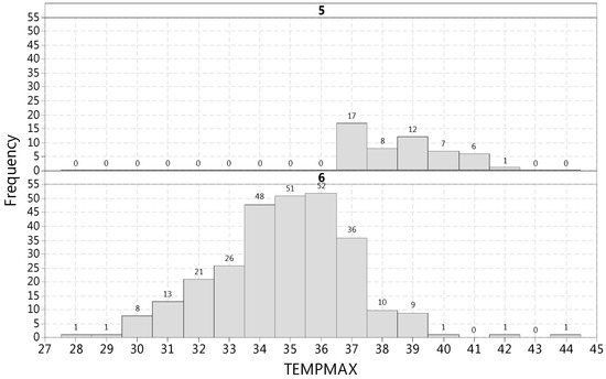 The maximum daily temperature (TEMPMAX) for the entire study period ranged from −1.82 to 43.80 °C, with a mean of 22.80 °C, while the maximum apparent temperature ranged from 1.53 to 48.51 °C with a mean of 24.45 °C (the apparent temperature is a metric of how hot it feels to people when air temperature, wind, and relative humidity are considered [29]). The distribution of the maximum temperature showed three modes, at around 17, 28, and 34 °C. The distribution of the maximum apparent temperature appeared to have two modes, at around 18 and 35 °C. The minimum daily temperature (TEMPMIN) for the entire study period ranged from −5 to 31.09 °C, with a mean value of 15.37 °C. The distribution of the minimum temperature had three modes (peaks), around 12, 18, and 26 °C, possibly corresponding to the prevailing weather conditions during the winter, the spring/summer, and the autumn months, respectively. The minimum apparent temperature ranged from −6.96 to 36.98 °C with a mean of 16.91 °C.