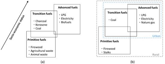 Several existing studies suggested two types of energy transition models in the residential sector—the energy ladder and energy stack ([2]; Figure 1a). The energy ladder theory assumes that households will move to more sophisticated energy carriers as their income increases. On the other hand, the energy stack argues that household energy transition does not simply move from one energy source to another. With increasing income, households instead adopt multiple fuel choices and sometimes users may switch back to traditional biomass even after adopting modern energy carriers.