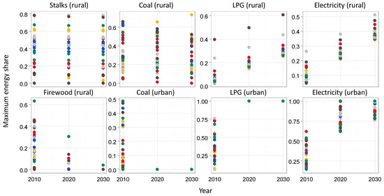 Figure 3 shows the estimated results of maximum energy share in 31 provinces based on the energy transition model described in Section 2.2. In Figure 3, each color represents one provincial region. Generally, the transition from primitive fuel (i.e., firewood and stalks) to advanced fuel (i.e., LPG and electricity) is observed in both urban and rural areas. For traditional biomass, stalks will still have a certain amount of share in most of the regions while the share of firewood will drop to a limited level. According to regression analysis results in Section 2.2, stalks’ share is negatively correlated with education level and firewood is negatively correlated with income. Thus, the larger the increase in the level of education and income is, the larger is the decrease in the level of maximum share of stalk and firewood. However, the level of income increase is expected to be much more drastic than the increase in the education level in the future (see Figure A1). Consequently, the share of firewood drops to a lower level compared to stalks.