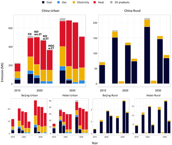 Figure 5 shows the estimated results of CO2 emissions in urban and rural areas. The national results in Figure 5 are an aggregated national total of 31 provincial regions. At the national level, the cost optimization simulation in AIM/Enduse results in the bulk of traditional biomass consumption in rural areas, hence an underestimation of CO2 emissions in the REF wo.ET. The huge emissions gap between REF wo.ET and REF w.ET leads to a conclusion that the energy transition process and its constraints have a significant impact on emissions estimation. To examine the impact of socioeconomic development on energy transition and carbon emissions, we select Beijing and Hebei as two socioeconomic representatives and compare their results. Geographically, Beijing Municipality lies in the center of Hebei province so their climate conditions are similar. Beijing is the capital city of China with a relatively higher socioeconomic status. Currently, per capita GDP in Beijing is more than twice that in Hebei [53]. In urban Beijing, coal will be completely phased out by 2030 and household energy choice will gradually switch to heat and commercial biomass. In rural Beijing, coal remains as the primary CO2 emitter, but energy consumption of coal decreases, which leads to reduction potentials in the INDC w.ET scenario. Compared to Beijing, Hebei has a lower socioeconomic status, which resulted in different energy choices. Urban households in Hebei use more coal and less electricity. Similar to Beijing’s projection, coal will be phased out in urban Hebei. However, electricity share will not increase to as high a level as Beijing due to lower income. It is pointed out that income level is one of the barriers of electrification. Compared to FIX, in the INDC w.ET scenario, CO2 emissions in urban Beijing, urban Hebei and rural Hebei reduced by 38%, 33% and 51% respectively. While rural Beijing is already at a relatively high socioeconomic status, the energy transition model projects that traditional biomass will be completely replaced by coal and other advanced energy sources by 2030. Rural Beijing is also an exception where the energy transition process leads to an emissions increase of about 23% in the INDC w.ET scenario. The optimization simulation is applied on a national level so reduction potentials can be allocated in other rural regions with lower socioeconomic status.