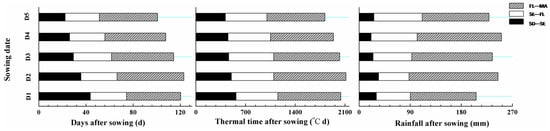 The averaged data (from 2010 to 2012) for precipitation and duration (in days and thermal time) of different potato developmental phases in five trials (D1–D5) are shown in Figure 3.