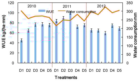 WUE for all sowing dates exhibited different changing characteristics among different precipitation years. In drought year (i.e., 2010), delayed sowing dates (D3, D4 and D5) significantly improved WUE compared to D1 and D2 (Figure 4), and D1 showed smallest WUE value. Earlier sowing dates (D1, D2 and D3) promoted WUE compared to D4 and D5 in 2011 (normal year) because of less water consumption, however, these increases for WUE came at the expense of reducing yields. In wet year (i.e., 2013), the WUE values in the D4 and D5 treatments were significantly higher than those in earlier sowing dates.