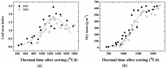 Relationship between leaf area index (LAI), dry biomass and thermal time after sowing in the year 2011 and 2012. Dry biomass included both above-ground and below-ground biomass. (a) LAI curve exhibited a bell shape and peaked at 2.0 as the thermal time was equal to 1300 °C day; (b) Dry biomass increased rapidly as the thermal time increased from 900 to 1500 °C day, and then the curve became flat and stayed stable at about 600 g m−2 after the thermal time reached about 1800 °C day.