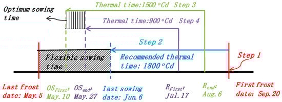 According to the daily temperature condition, the elasticity of sowing date can be determined in following steps. First, determine first and last frost dates. In meteorology, frost day is defined as the day with the daily minimum air temperature <2 °C. Based on the daily minimum temperature data over the period 1960 to 2012 in the study area, first frost date (20 September) and last frost date (5 May) was calculated (Figure 6 Step 1).