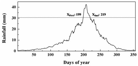 Based on the changes in the annual cycle of rainfall from 1960 to 2012 in the study area, the greatest precipitation occurred from 17 July (199th day of year, marked by RFirst) to 6 August (219th day of year, marked by REnd), as shown in Figure 7. Setting REnd as the starting point and counting 1500 °C day thermal time backward from REnd, the first optimal sowing date was calculated as 10 May. Similarly, aggregating temperature backward from RFirst until the thermal time reaching 900 °C day, the last optimal sowing date was determined as 27 May (see Figure 6). The optimal sowing time for potato in study area, which is the intersection between flexible sowing date and possible optimal sowing dates, was then determined as between 10 May and 27 May.