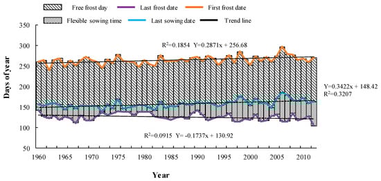 Changes of flexible sowing time, first frost date, and last frost date in study area over the period 1960 to 2012. Trend lines were fitted for last frost date, first frost date, and last sowing date. Results showed the flexible sowing time has increased by 5.1 day/decade due to the advanced last frost date (1.7 day/decade) and delayed last sowing date (3.4 day/decade).