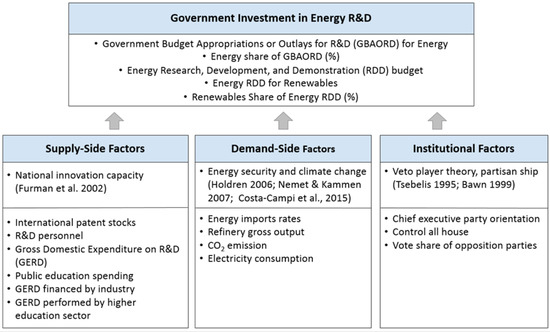 In an effort to understand the sources of such variations in government investment in energy R&D, we have formulated an analytical framework to help sort out a multitude of factors directly or indirectly influencing public investment on energy R&D including governmental expenditures on renewable energy R&D. The framework consists of three—supply-side, demand-side, and institutional—dimensions, derived from the previous literature on the socioeconomic and infrastructural factors underpinning energy R&D. Based on this framework, our empirical analysis examines a score of potential determinants of cross-national variations in government investment in energy R&D in general as well as R&D on renewable energy using the panel data from 34 OECD countries for the period of 1974–2012.
