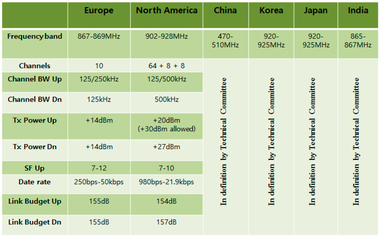 Long-range wide-area networks (LoRaWANs) specify a physical (PHY) and medium access control (MAC) layer protocol for an extremely long-range and low-power network, which is standardized by LoRa alliance. The major advantage of LoRa is in the long-range capability. According to LoRa Whitepaper [17], entire cities or hundreds kilometers in radius can be covered by a single LoRa base station or LoRa gateway. Using chirp spread spectrum (CSS), LoRa can significantly increase communication range while maintaining robustness to interference. These characteristics are attractive for many IoT applications, and many regions and countries are trying to accept the LoRa technology on their regional ISM band. Figure 1 shows the LoRa regional spectrum usage.