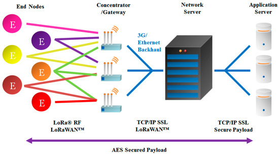 One of the outstanding features of LoRaWAN is based on a star topology connected to the network server in which gateways play a role in relaying messages between end devices and the network server as shown in Figure 2. Gateways have two independent communication links: LoRa communication and IP backhaul. The supported data rates are 0.3–50 kbps. In addition, LoRa provides an adaptive data rate (ADR) function.