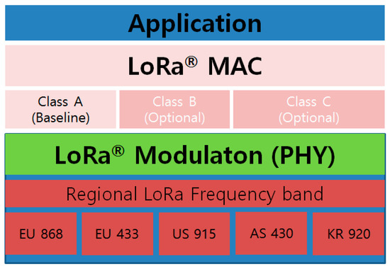 Figure 3 shows LoRa protocol stack (PHY and MAC). Based on regional ISM band, physical layer includes LoRa modulation, and according to application characteristics, MAC has three different classes: Class A (baseline), Class B and C (optional). Class A is used for the low-energy end devices and allows bi-directional communication between end devices and network server. However, downlink communication from network server to each end device is only allowed shortly after the end of uplink transmission of an end device.