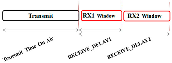 As shown in Figure 4, shortly after uplink transmission, the end device allows two RX windows 1 and 2 during RECEIVE_DELAY1 and 2, respectively. For RX1 window, the same channel and data rate as those used in uplink transmission are used, but RX2 window is allowed to use a different channel and data rate from the uplink transmission.