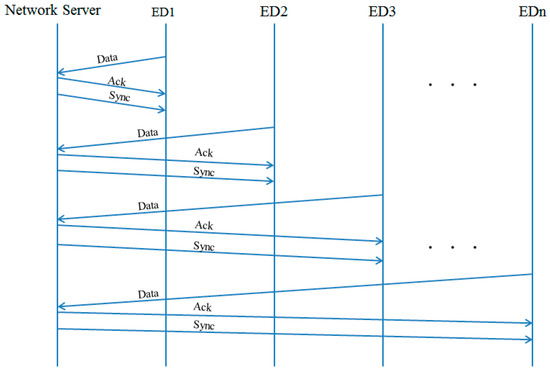In general, end devices transmit sensing data periodically to the network server. In this case, time synchronization between devices and the network server is required. Such time synchronization tasks should be not often but periodically executed. In the case of LoRa standard (class A), for all end devices to be synchronized with network server, the only way is to use its own RX window followed by individual uplink data transmission. However, this results in significant traffic increase in the network as shown in Figure 5.