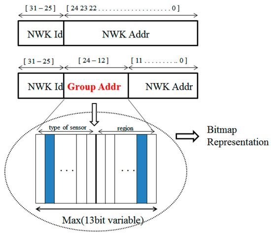 As shown in Figure 6, the standard DevAddr is divided into NwkId field and NwkAddr field. Without changes in the NwkId field, we partition the NwkAddr field into Group Addr field and NwkAddr field. It is important to note that unlike the other id field, the Group Addr field is represented not by a numeric number but by a bitmap. The Group Addr field is variable from 8 to 13 bits and the rule is defined by network server. The Group Addr field can also be divided into Type of Sensors (TOS) field and Region field. TOS is used to define the type of sensors equipped in an end device. For instance, Temperature, Humidity, Infrared, Light sensors can be represented respectively as follows: ‘1000’, ‘0100’, ‘0010’, ‘0001’. Representation of multiple sensors is also available. The bitmap ‘1100’ means temperature and humidity sensors. In addition, since LoRa can have long coverage, a single LoRa BS or LoRa Gateway can cover more than a few kilometers. Therefore, the divided subareas can be represented in the region field in the Group Addr. For example, as shown in Figure 6, the area which is covered by a single gateway is divided into four subareas such as A, B, C, and D. So, the information of subareas can be represented as follows: ‘1000’, ‘0100’, ‘0010’, and‘0001’. Based on the type of sensors and regional information, Group Addr is determined and then NwkAddr is arbitrarily assigned by network server.
