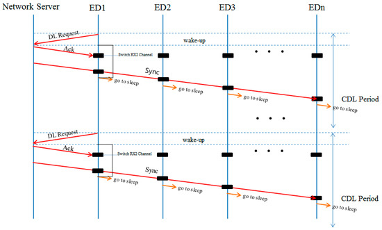 On the other hand, CDL enables devices to be synchronized concurrently with the network server utilizing broadcast RX window triggered by a DL initiator. As shown in Figure 7, in order to make the RX window broadcast, the DL initiator sends a DL request message to the network server periodically (generally, we consider every hour), and network server can use the broadcast RX window for broadcasting time information. Considering average clock drift, time synchronization may be performed at most once a day. The first RX window for downlink following DL request message is used for transmitting an ACK frame to the DL initiator, the network server captures the current time at the end of the first RX window, and then at the beginning of the second RX window, the captured time information is broadcasted. All the nodes in the network wake up at the beginning of the RX2 window and wait for the broadcast message from network server for the RX2 windows duration. On the reception of time synchronization message, nodes reconfigure their RTC to the time information received from the network server. It is important to note that unlike LoRa standard in which individual device should each be synchronized with a network sensor, since all nodes in CDL are capable of being synchronized by receiving time information of network server at the same time, traffic in the network is significantly reduced and thus the time difference between devices may be reduced.
