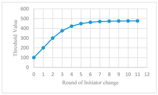 This results in log scale variation of threshold value as shown in Figure 8. That is, it starts with small value but threshold value is maintained with a similar value when reaching almost maximum value. This makes it possible to continuously find a candidate node, which consumed the least energy, and enables the node to become a new DL initiator. Threshold value change is also performed together with a DL initiator change event. Therefore, since CDL dynamically elects a DL initiator node considering the Fcnt value of all nodes in the network, the power imbalance problem occurring due to periodic DL request message transmission can be resolved.