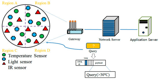 The Group Addr field already includes functionality capable of configuring a region field as well as sensor type field. Using the region field, the network server can receive data only from the sensors which are in a specific area without assistance of GPS. In particular, since the LoRa can cover more than a few kilometers in radius, it is necessary to divide into subareas the area which is covered by a single gateway. For instance, as shown in Figure 10, if a sensor field can be divided into four subareas (A, B, C, and D), CDL enables gathering sensor data only from sensors which are in a specific area. In this case, a user (application server) requests the recent data in the particular area, then the network server sets the corresponding bitmap in the region field and broadcasts the message into the network. Only the nodes in the interest area (e.g., area A) can respond to the network server. In addition, since the region field is expressed by bitmap, data gathering from multiple areas is also possible. For example, if the region field contains ‘0101’, it means both regions B and D. In addition, more advanced data-centric aggregation is available by utilizing a combination of sensor type field and region field. For example, the query can be as follows: only the nodes of which temperature is below 0 °C in the area A and D.