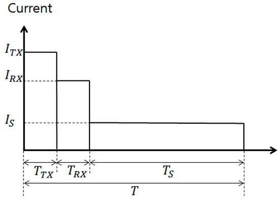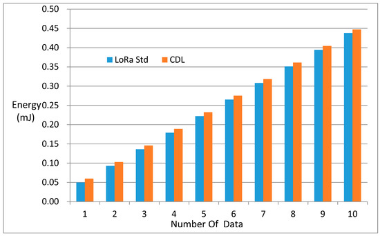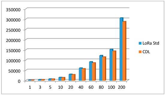 One of the most important features of LoRa is its low-power communication capability. This low-power capability is very attractive for a variety of IOT applications. This experiment evaluates energy consumption of LoRa standard and CDL. LoRa gateways are not considered because they are supplied with AC power. The current consumption at each state is shown in Table 2. (They include MCU current consumption). As shown in Figure 12, to measure the power consumption, we divide into the following three states (TX state, RX state, SLEEP state), integrate the consumption current according to each state into each state time, The power consumption was calculated by multiplying the power consumption by the power consumed during one hour. Figure 13 shows the results of increasing the number of data transfers per node from 1 to 10 for one cycle (1 h). In fact, CDL is an extended version of the standard LoRa, yet it accommodates all of the low-power features in LoRa, so the energy consumption of each node is not significantly different. This does not take into account the effects of broadcasts, and if time synchronization is taken into consideration, energy consumption may be slightly less than that of the standard LoRa.