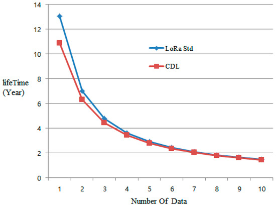 To further understand the more intuitive energy consumption, we also calculated the battery life of a node based on two AA batteries. Figure 14 shows the battery life when transferring data from 1 to 10 times per hour. As shown in the figure, when the data is sent once or twice in one hour, the CDL tends to be somewhat shorter than the standard LoRa due to the additional energy consumption for maintaining the shared downlink slot. However, as the number of data increases, it converges to the consumed amount. Also, considering the data transmission once per hour, CDL can guarantee a lifetime of more than 10 years as well as LoRa, which is also suitable for long life applications such as remote meter reading.