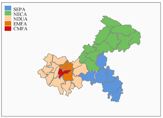 In addition, at the beginning of becoming a municipality, Chongqing was divided into two spatial parts by the local administrative system, namely, the main urban areas and suburb areas, as shown in Figure 2. Furthermore, regional policies of Chongqing were also according to this division for a long time. After that, given spatial differences, characteristics of nature, economics and society in each region were taken into consideration. Consequently, more positive and specific regional development strategies were taken, such as “Three Economic Zones”, “Four Development Areas”, and “One Circle and Two Wings”. At present, the strategy of “Five Function Areas” is being conducted. As shown in Figure 3, according to the strategy of “Five Function Areas”, Chongqing is divided into Core Metropolitan Function Area (CMFA), Extended Metropolitan Function Area (EMFA), Newly Developed Urban Area (NDUA), Northeastern Ecological Conservation Area (NECA), and Southeastern Environment Protection Area (SEPA). Since the strategy of “Five Function Areas” was proposed in 2013, Chongqing has made regional policies based on this regional division, namely, each region has its unique orientation and regional policies according to this regional division.