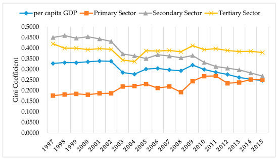 Per capita GDP is widely used to compare the regional inequality [21,22,23,27,49,55,56], and this study will select per capita GDP as the indicator that can reflect the regional inequality objectively. Due to China’s sector consisting of the Primary Sector, the Secondary Sector, and the Tertiary Sector, naturally, the per capita GDP of each sector is selected as the indicator to measure the each sectoral regional inequality.