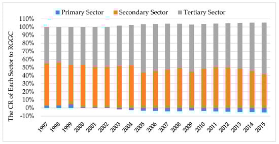 The calculation results through Formula (7) can be seen in Figure 5: (1) firstly, the CR of the Primary Sector is the lowest and has been negative since 2003. (2) Secondly, in general, the CR of the Secondary Sector decreases with fluctuations from 52.19% in 1997 to 43.80% in 2005 firstly, then increases to 50.41% in 2011, and afterwards, it declines to 41.50% in 2015 gradually. (3) Thirdly, although there are some shocks, the CR of the Tertiary Sector increases from 44.99% in 1997 to 63.97% in 2015 roughly. (4) Finally, compared with the Tertiary Sector, the CR of the Secondary Sector is greater than the CR of the Tertiary Sector at first, whereas the CR of the Tertiary Sector has exceeded that of the Secondary Sector since 2005, and the gap between them has been widening gradually in recent years.