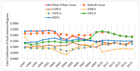 Secondly, both the Gini Coefficient of main urban areas and the Gini Coefficient between them decreases gradually in general, namely, the Gini Coefficient of main urban areas declines from 0.2345 in 1997 to 0.1444 in 2015 and the Gini Coefficient between them falls from 0.1977 to 0.1499 in the same period. However, the Gini Coefficient of suburban areas decreases firstly from 0.2160 in 1997 to 0.1988 in 2007 and then increases to 0.2261 in 2009. Afterwards, it steadily declines to 0.1885 in 2015.