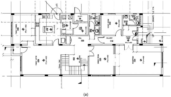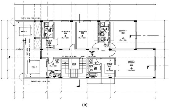 Figure 2b. The window-wall ratio (WWR) is almost 10%. The structural members on the external facade are concrete masonry units (CMU), hollow blocks, while the roof is constructed with reinforced cement concrete (RCC) slab and some other composite materials. Windows are double glazed with aluminum frame. The HVAC system used in these residential buildings is a constant-volume DX unit, while two separate units are installed on the rooftop, one for each floor. The capacity of the HAVC system at the ground floor is 11.9 tons, and the supply of air flow is approximately 11.3 ACH. The capacity of the HVAC system on the first floor is 9.4 tons, and the supply airflow is 9.4 ACH. The lighting power density at the ground floor and first floor is respectively 21 W/m