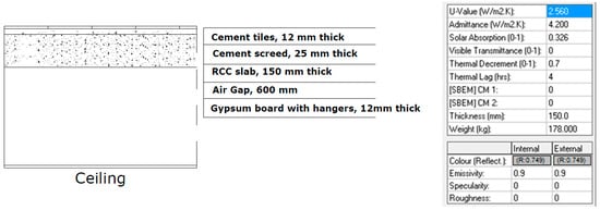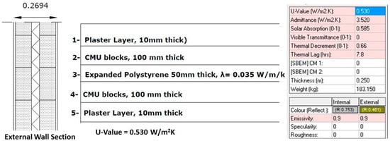 Figure 3 shows the x-section of the external wall and its thermal properties. Moreover, in partition walls, again, 150-mm CMU blocks are used with plaster on both sides.