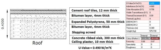 In the existing roof section, a 300 mm-thick ribbed concrete slab is used as the structural member, and above it, cement screed is provided for sloping purposes. The bitumen layer is there above the concrete layer for water proofing. Fifty millimeter-thick polystyrene is used as insulation, which might be less, as 70% of the heat is absorbed by the roof, so this may be the most critical area that needs more attention. Above the insulation layer, again, the water-proofing membrane is provided with the cement tile on top. The thermal conductivity value, calculated for the whole section, is 0.490 W/m