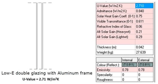 In windows, low-e double glazing is used with an aluminum frame, which has a U-value of 2.71 W/m