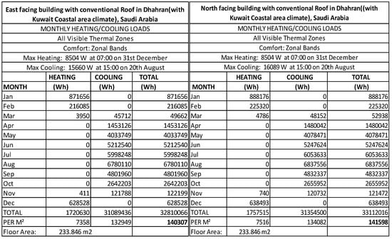 Figure 11, shows the results generated by the software with east- and north-facing models and with the conventional (existing) roof. These results are summarized in