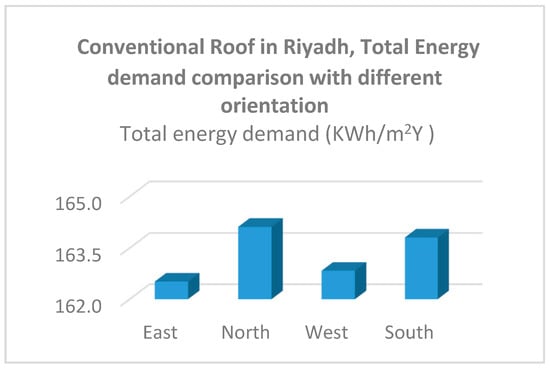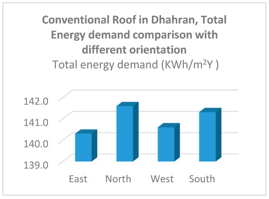 If we are going to compare the total energy demand in two different climates, which are Dhahran and Riyadh, with the existing conventional roof, then the result generated by the software clearly tells that the total energy demand in Riyadh would be almost 14% higher along different orientations, as shown in