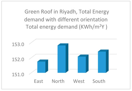 Now, the conventional roof (existing) is replaced with the green roof in Riyadh, and the analyses are made in four different orientations. In terms of orientation, the trend of the energy demand is almost same as the green roof in Riyadh, as east-west is the most suitable orientation with the minimum energy demand, while north-south has the maximum energy demand as shown in