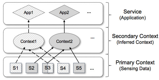 Figure 1, the primary context corresponds to the raw value obtained from actual sensing operations such as GPS location fix and acceleration value. This is utilized to inform secondary contexts based on the business logic of a context-aware application. In conventional methods for low-power consumption, low-power can be achieved by caching the secondary context. Conversely, the inference of the exclusive contexts occurs in the primary context. With respect to the assumption that context 1 and context 2 in