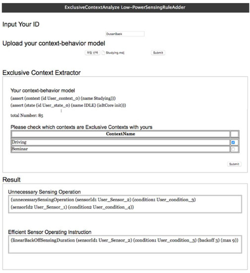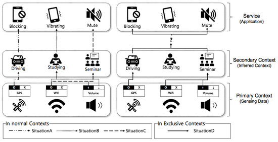 Figure 2, each context-aware application provides a service based on the context of the user. Additionally, each context is inferred by analyzing the sensing data of the sensors in the device. Therefore, the developer of the context-aware service sets the provision of context appropriate to the service and then commands the sensing operation to infer the context. The sensing data collected through the sensing operation is used to confirm whether or not the data supports the context. The context inference algorithm used at this time is designed and implemented by the developer. Therefore, if the accuracy of the inference algorithm is 100%, then exclusive contexts that cannot logically exist at the same time will not be inferred simultaneously such as the driving and seminar, driving and studying, and studying and seminar contexts. However, if the accuracy of the inference algorithm is not 100%, then it is possible to infer exclusive contexts due to incorrect inference of the context. If such exclusive contexts occur simultaneously, then it is not possible to provide a well fitted-service based on the user’s context, and therefore the power consumed in this type of a situation becomes meaningless. This study involves accounting for the exclusive contexts that are not considered by existing context-aware services and reduces inefficient sensing operations in exclusive contexts for sustainable context-awareness. In other words, in this paper, we try to improve the efficiency of power consumption by correcting the inefficient power consumption caused at the application level (faulty design, etc.) through the context-related information.